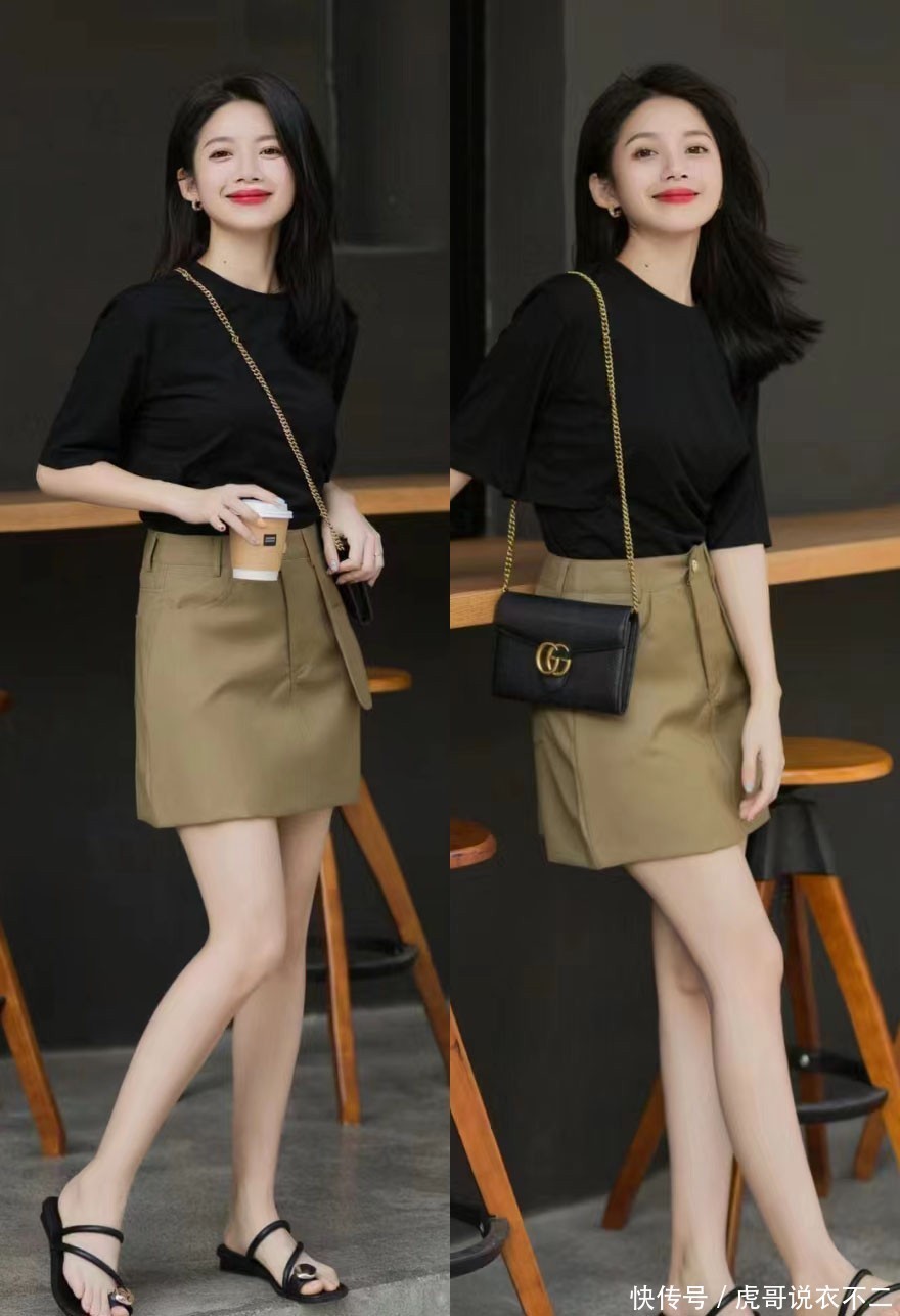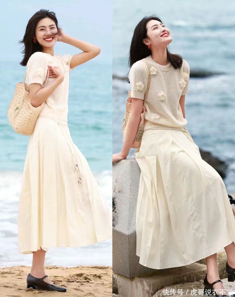 像这位女士的夏日look中,就选定了真挚T恤与米白色半身裙,两者比拟靠拢的配色,天然会交融出极具举座感的一面。
