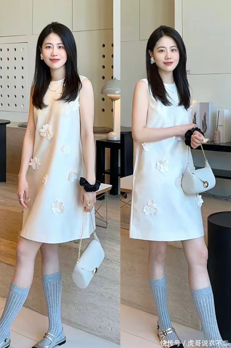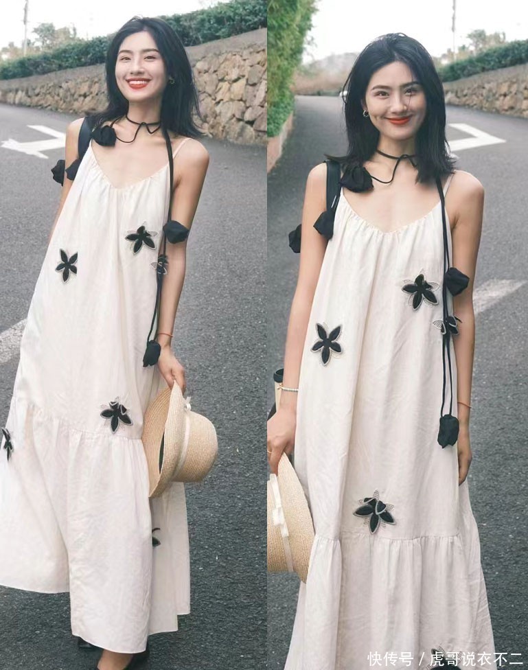 像是这位博主衣着的吊带连衣裙,就应用白色行为底色、并在名义加入了玄色五角星的野心,涓滴不忙绿的评释出了更个性的前锋形象。